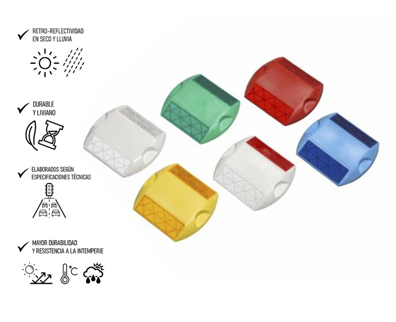 Están fabricadas en ABS de alta resistencia y relleno arenoso de alta adherencia. Cuentan con una superficie prismática que refracta la luz incidente en la misma dirección y sentido contrario. Esto las hace muy visibles para los conductores, incluso en condiciones de poca luz.